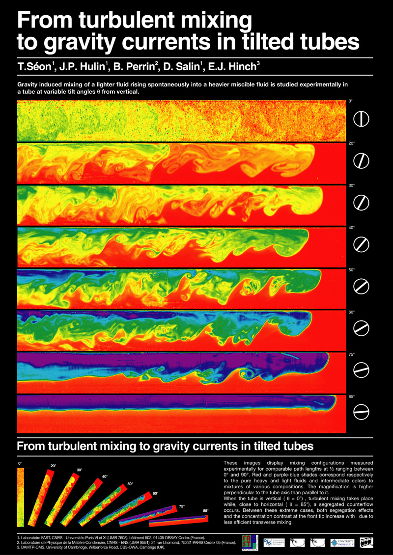 Buoyant mixing of a lighter fluid rising spontaneously into a heavier miscible fluids in a tube at variable tilt angles is presented in the following video :